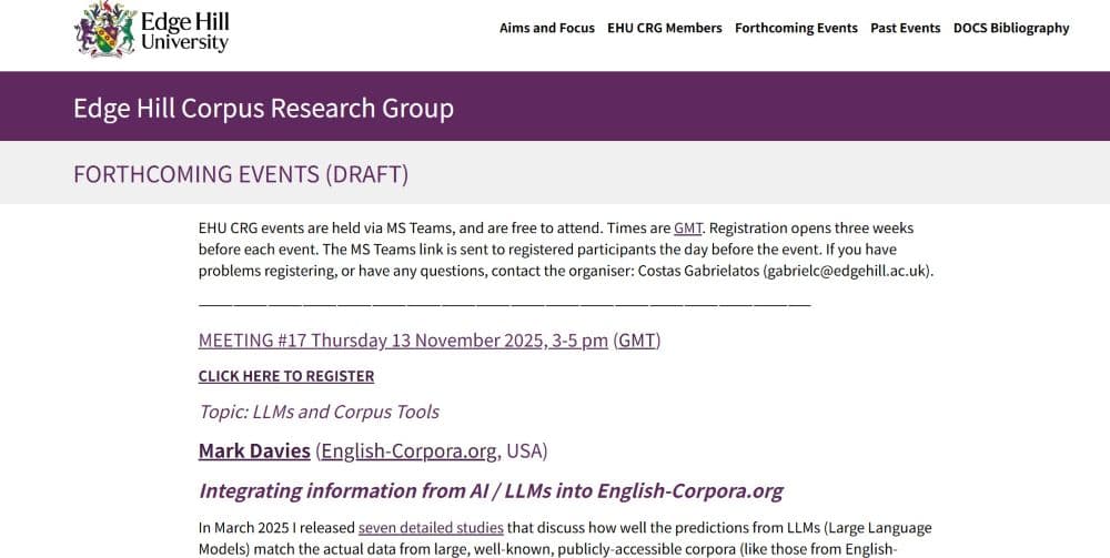 Edge Hill Corpus Research Groupによるイベント(2025年11月13日)で、Mark Daviesによる講演が予定されています。タイトルは、”Integrating information from AI / LLMs into English-Corpora.org”. イギリス時間で15時ですから、日本は深夜になります。とりあえず参加できる時間という方も多いのではないでしょうか。詳細は以下をご覧ください。イベントページへのリンクはこちら