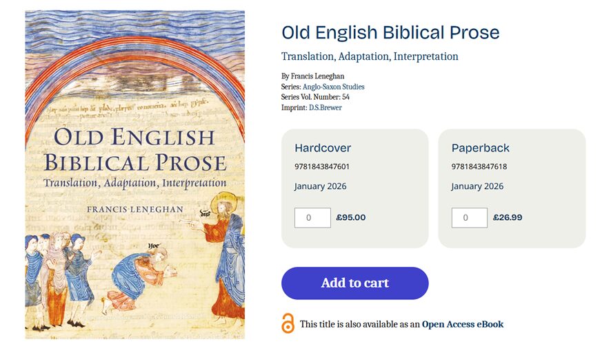 Francis LeneghanによるOld English Biblical Prose: Translation, Adaptation, Interpretation の案内を見ました。オープンアクセスになっていますので、どなたでも自由に本文にアクセスできるようです。