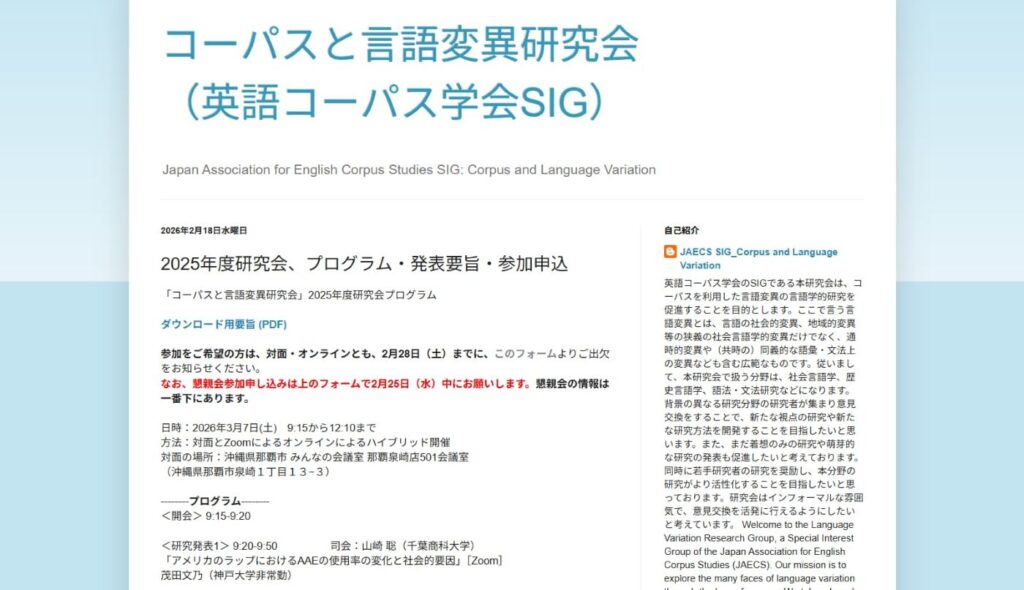 英語コーパス学会のSig、コーパスと言語変異研究会の2025年度研究会が3月7日(土)に対面とオンラインで開催されます。対面の場合の会場は、那覇市みんなの会議室です。対面、オンラインの参加とも事前の登録が必要ですので、詳細はホームページをご覧ください。5件の研究発表が予定されています。