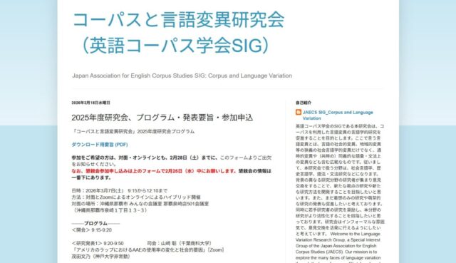 2026年2月23日 / 最終更新日時 : 2026年2月23日 Castlecliffe コトバの面白さ 英語史研究会第35回大会の案内 英語史研究会第35回大会が、2026年4月11日(土)に大阪大学で開催されます。英語史研究会の大会情報ページをご覧ください。できるだけ事前の申し込みが求められているようです。大会情報ページのフォームから入力が可能です。