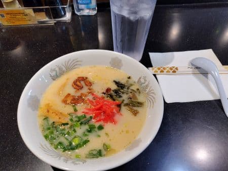 こちらはハワイのワイキキのとんこつラーメンです。海外、特にアメリカは食事のボリュームがいつも大き目なので、ミニを注文しました。本来、ミニはほかにチャーハンや餃子を注文する人のためのもののようです。