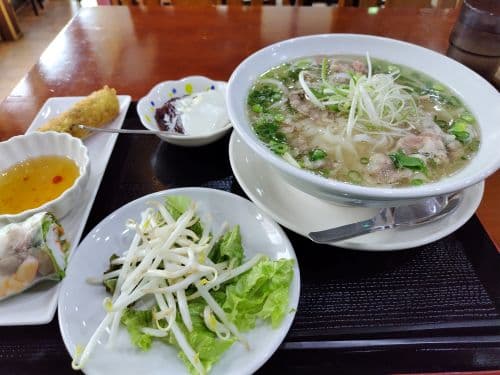 神戸三宮、阪急西口近くのベトナム料理のお店のフォーのランチです。かなりのボリュームでしたので、すっかり満足して、そのあとお昼寝をしたい気分になりました。ランチメニューでは春巻き2種(生春巻きと揚げたもの)とのセットになっていました。あとはよいサイズ感のサラダとデザート。大変お得感のあるセットです。ただし、支払いは現金のみでした。(2025年)